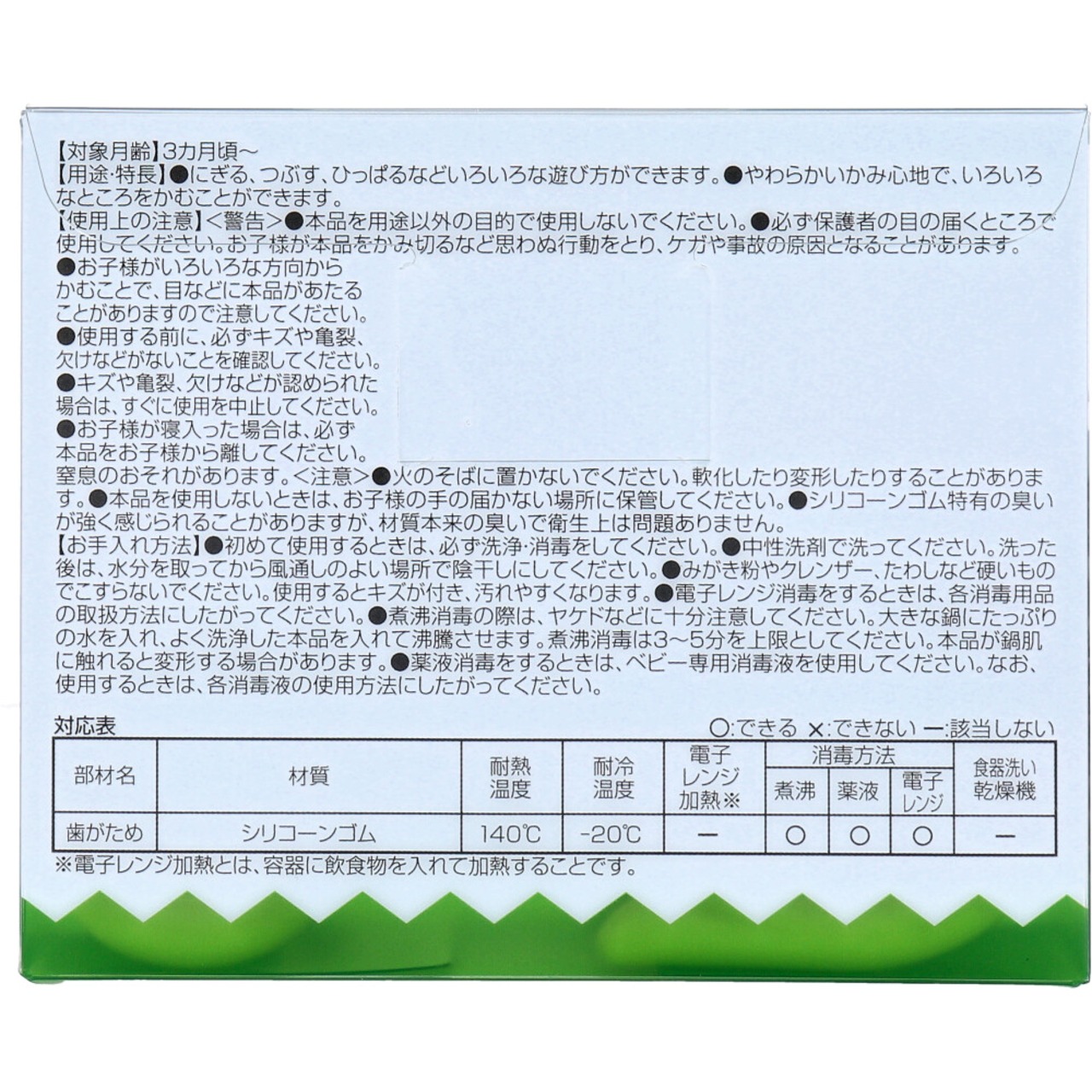 噛んで、つぶして、ひっぱって。小さな手でもにぎりやすく、やわらかいかみ心地の歯がためです。