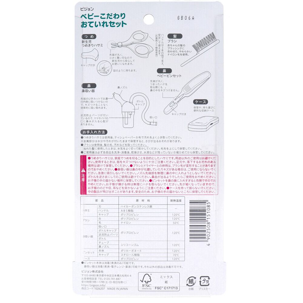ハサミ・・・刃:ハイカーボンステンレス鋼/ハンドル:ABS樹脂/キャップ:ポリプロピレン(120度)ブラシ・・・台:ポリプロピレン(120度)/毛:ナイロン(50度)鼻吸い器・・・吸い口・ボトルキャップ・逆流防止パーツ・ボトル:ポリプロピレン(120度)/チューブ・鼻ノズル:シリコーンゴム(120度)ピンセット・・・本体:ポリカーボネート(120度)/キャップ:スチロール樹脂(70度)ケース・・・ポリプロピレン(120度)