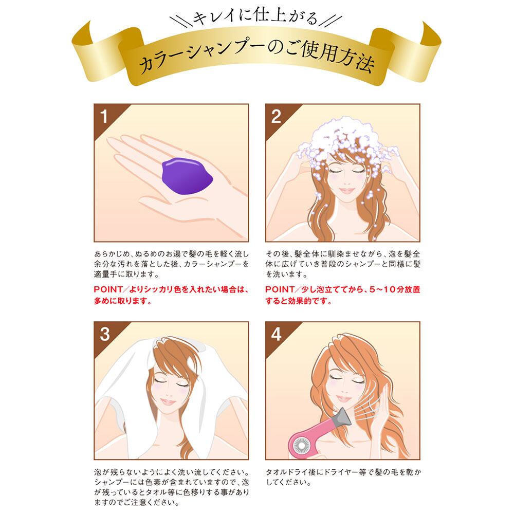 ・髪全体をぬらしてからシャンプー適量を手に取りよく泡立ててカラーした髪につけ、そのまま数分放置したあとによく洗い流してください。