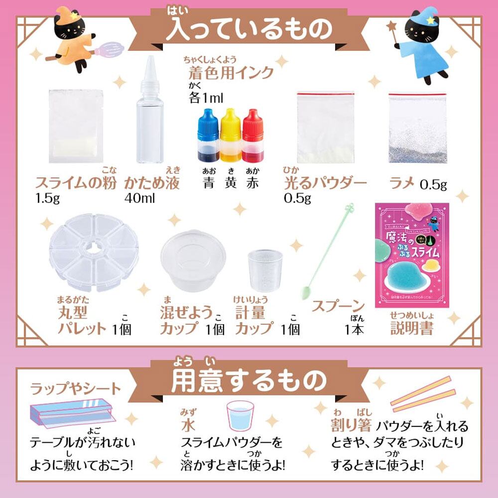 ・スライムの粉:グアーガム・かため液:ホウ砂水溶液・かため液容器:PET、PP・着色用インク:色素(赤色102号、青色1号、黄色4号)・着色用インク容器:PE、PP・光るパウダー:蓄光顔料・ラメ:PET、アルミ・丸型パレット:PP・混ぜようカップ:PP・計量カップ:PP・スプーン:PP・説明書:紙