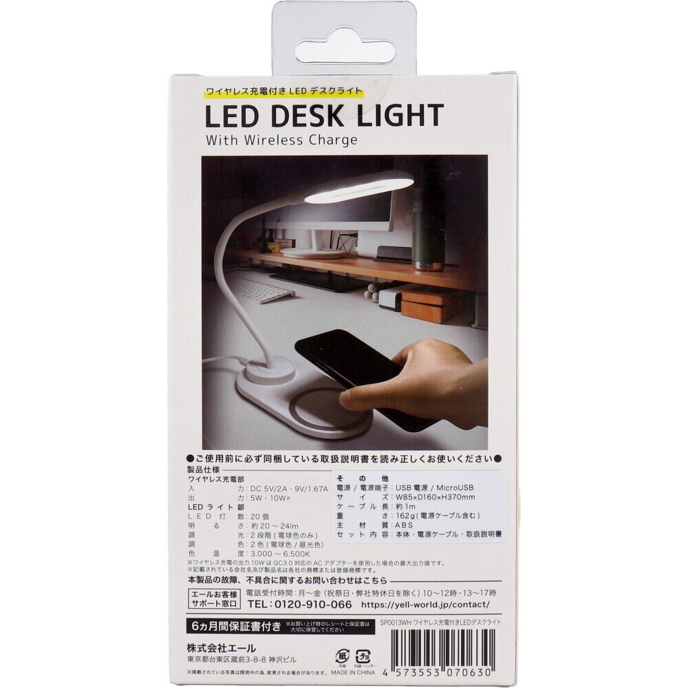 入力:DC5V/2A・9V/1.67A出力:5W・10WLED灯数:20個明るさ:約20〜24Lm調光:2段階(電球色のみ)調色:2色(電球色・昼光色)色温度:3,000〜6,500K電源:USB電源/microUSBサイズ:W85×D160×H370mmケーブル長:約1m重さ:162g(電源ケーブル含む)主材質:ABSセット内容:本体・電源ケーブル・取扱説明書※ワイヤレス充電の出力10WはQC3.0対応のACアダプターを使用した場合の最大出力値です。
