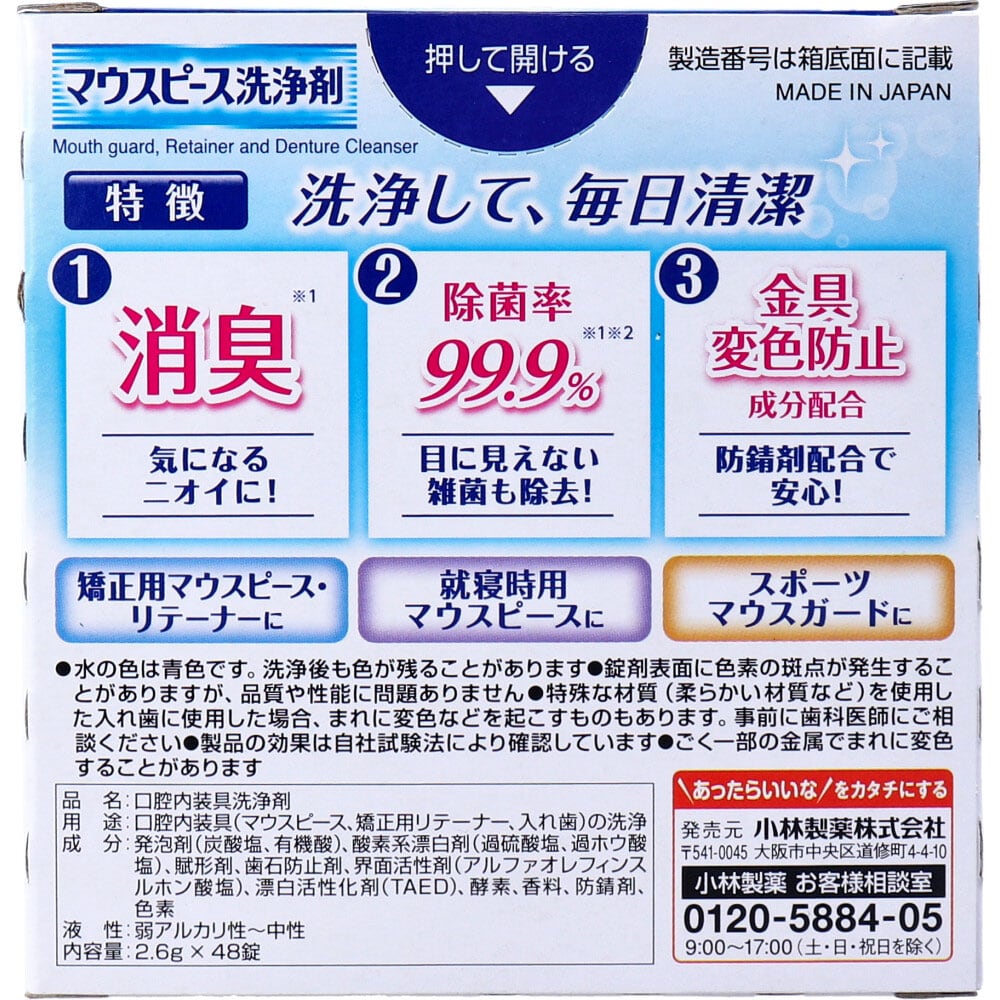 開けたまま放置すると発泡しないことがある・湿気の少ない涼しい場所で保管する・高温となる場所に置かない・マウスピース、矯正用リテーナー、入れ歯の洗浄以外には、使用しない