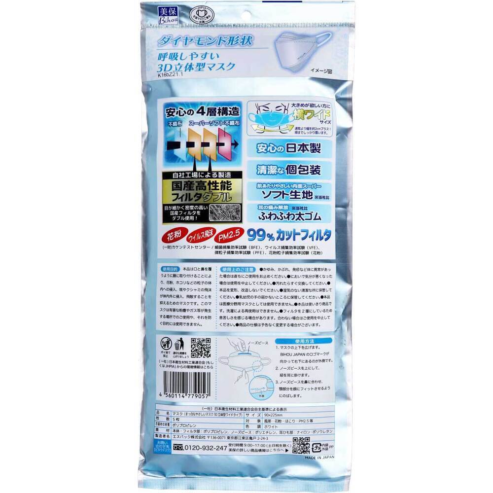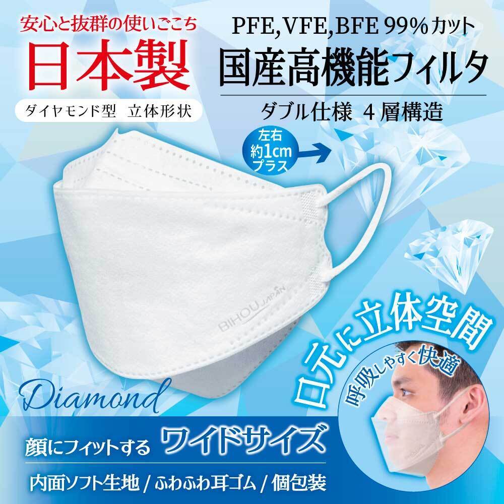 ダイヤモンド形状の呼吸しやすい3D立体型マスクです。しっかり覆う横ワイドサイズ。大きめが欲しい方に。通常より幅を約2cmプラス。頬までしっかり覆います。