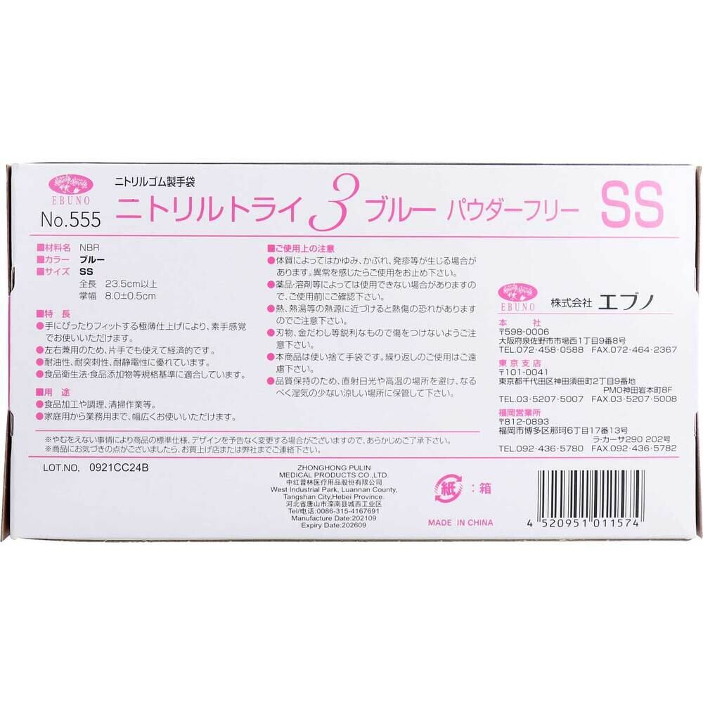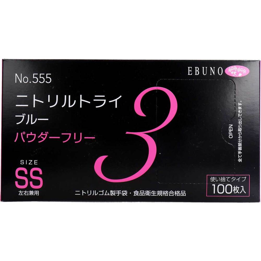 【業務用】No.555 ニトリルトライ3 ブルー パウダーフリー ニトリルゴム製 使い捨て手袋 SSサイズ 100枚入