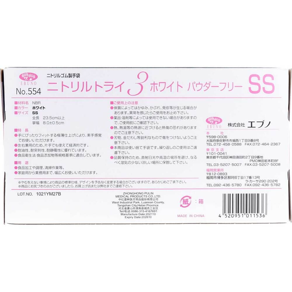 【業務用】No.554 ニトリルトライ3 ホワイト パウダーフリー ニトリルゴム製 使い捨て手袋 SSサイズ 100枚入
