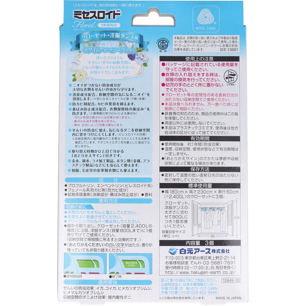 ミセスロイドフローラル 防虫剤 クローゼット・洋服ダンス用 1年 ホワイトアロマソープの香り 3個入
