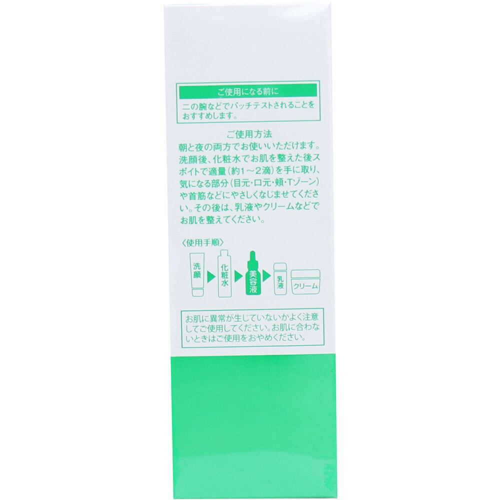・洗顔後、化粧水でお肌を整えた後スポイトで適量(約1〜2滴)を手に取り、気になる部分(目元・口元・頬・Tゾーン)や首筋などにやさしくなじませてください。