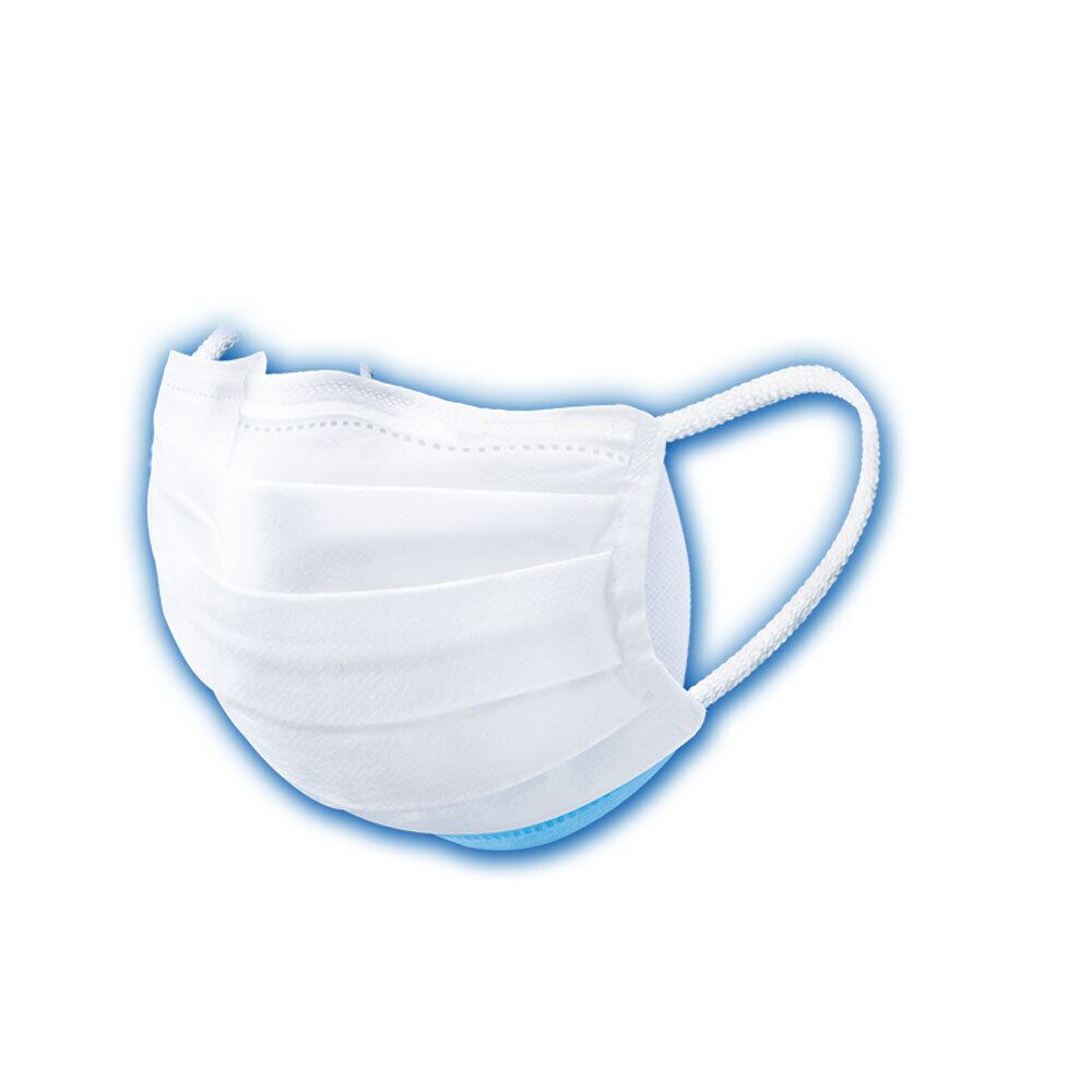 ●「新型 4 方向プロテクト構造」「ダブルオメガ加工&マウスバー」により、マスクと顔の隙間をブロックし、微粒子の侵入を妨げるとともに、口元の空間をキープして息苦しさを解消し、口の動きに柔軟に対応します。マスクの表裏がわかりやすくなるよう、あごにあたるアンダーブロッカーには色を付けました。