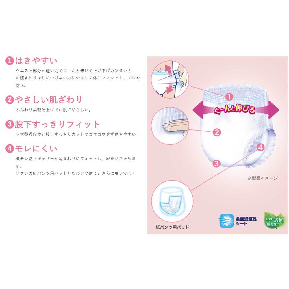 ●モレにくい横モレ防止ギャザーが足まわりにフィットし、尿をせき止めます。リフレの紙パンツ用パッドとあわせて使うとさらにモレ安心。