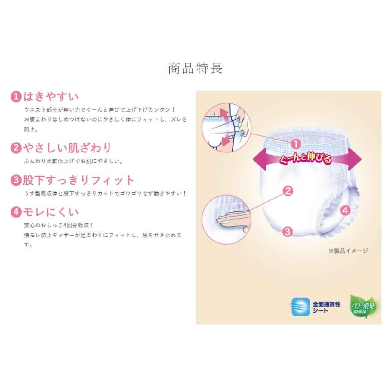 うす型長時間安心パンツ。ウエスト部分が軽い力でぐーんと伸びて上げ下げカンタン。お腹まわりはしめつけないのにやさしく体にフィットし、ズレを防止。