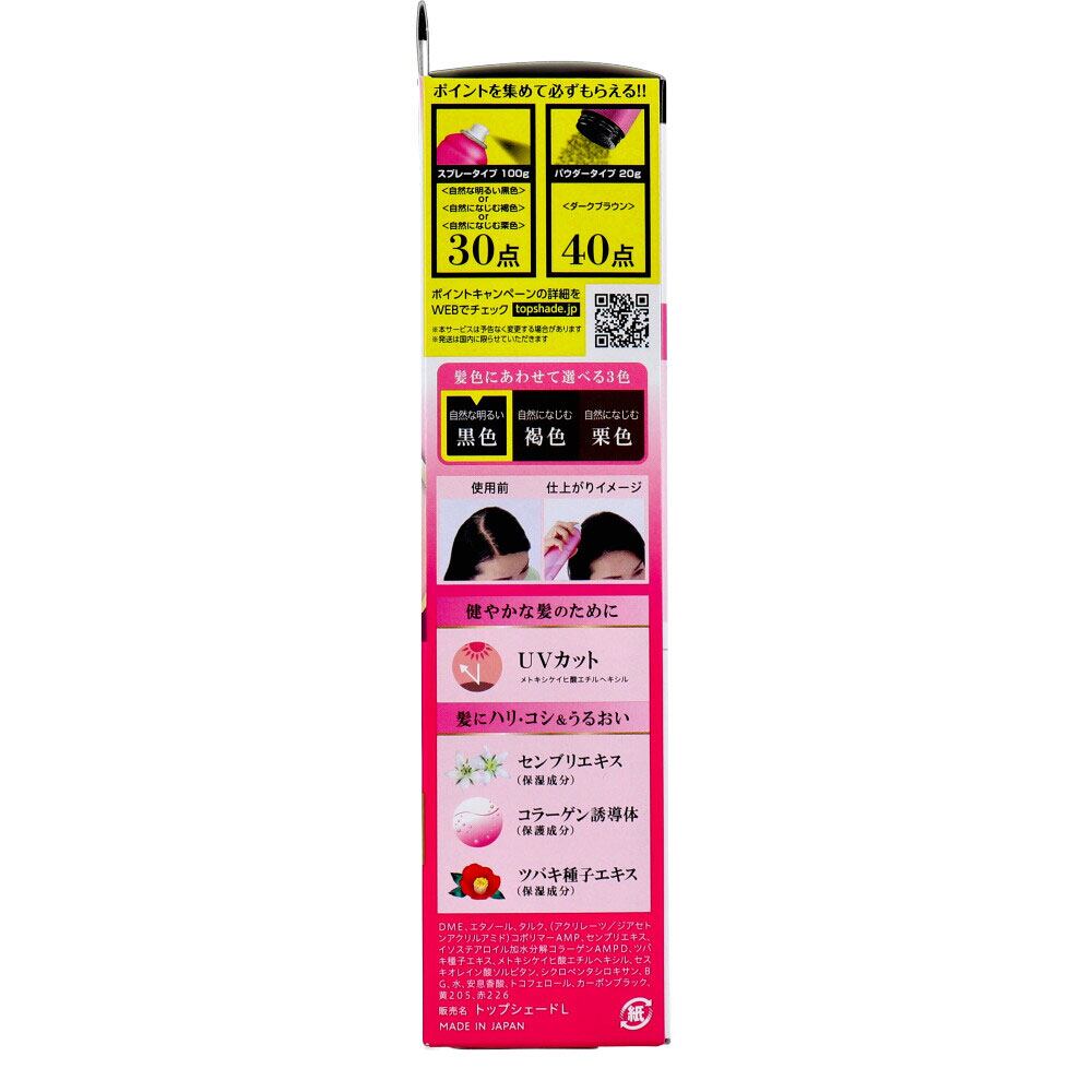 ●スプレータイプ。立体感のある微粉末が、髪1本1本を包み込み、髪を太く多く見せます。ふんわり自然な髪を演出。生え際、分け目、頭頂部に。