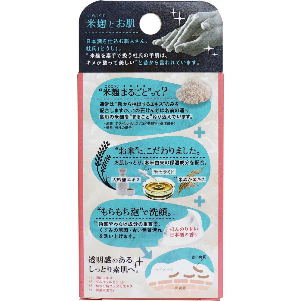 石ケン素地、水、PPG-9ジグリセリル、アスペルギルス/コメ発酵物、アスペルギルス/コメ発酵液、酒粕エキス、グルコシルセラミド、セラミドNP、セラミドAP、セラミドEOP、加水分解コメヌカエキス、コメ胚芽油、コメデンプン、炭酸水素Na、トレハロース、ワセリン、アロエベラ液汁、クエン酸、ポリクオタニウム-39、BG、トコフェロール、エタノール、ラウロイルラクチレートNa、a-グルカン、フィトスフィンゴシン、コレステロール、キサンタンガム、カルボマー、香料