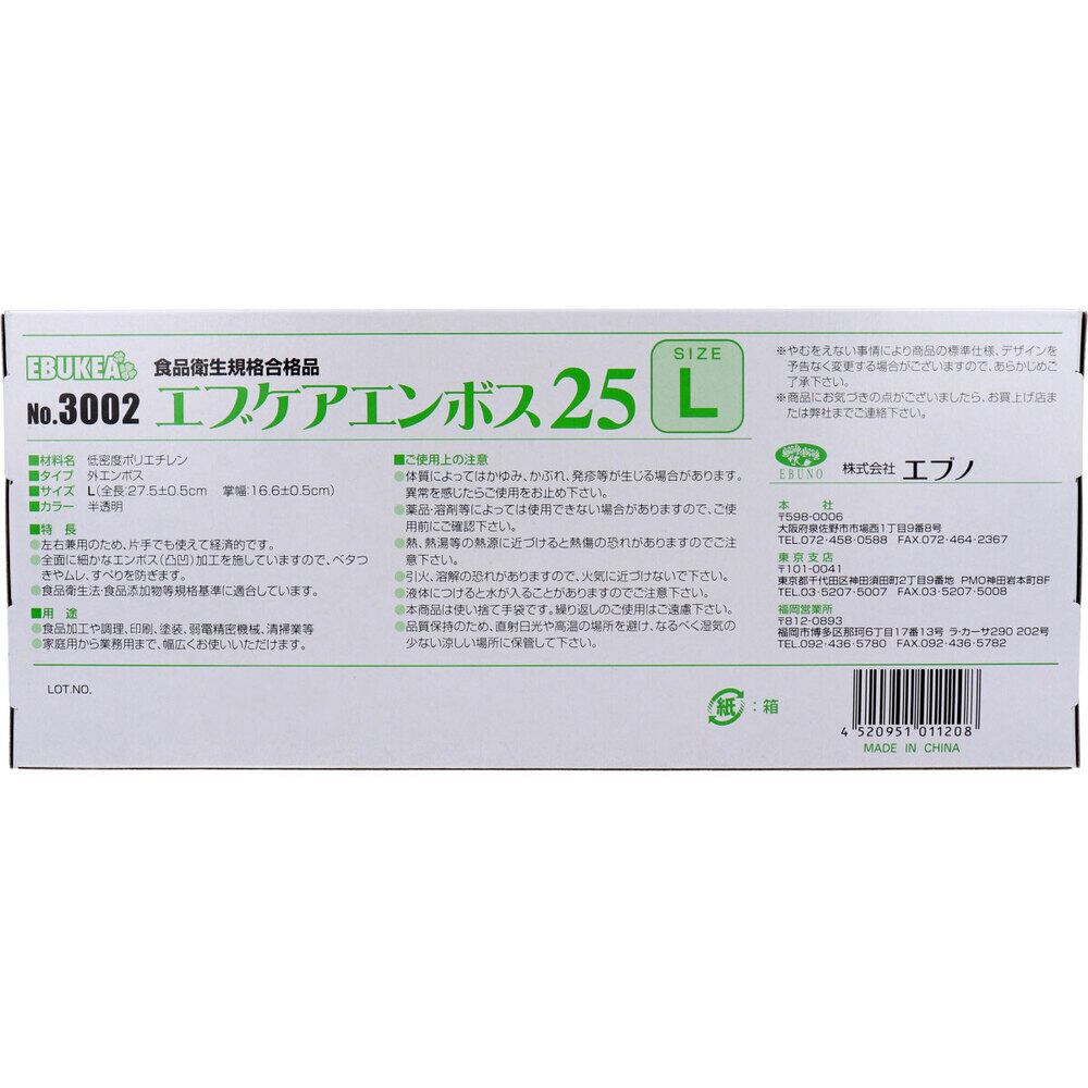 【業務用】No.3002 エブケアエンボス25 食品衛生法適合 使い捨て手袋半透明 Lサイズ 箱入 100枚入