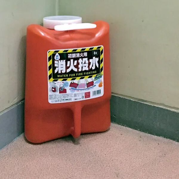 〇部屋や廊下のコーナーに置いておき、万が一の火災時に初期消火用水として活用できる「消火投水(しょうかとうすい)」です。