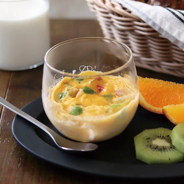 1.卵を割り入れる2.卵黄をピックで崩す3.電子レンジ出力500Wで30-40秒加熱する。