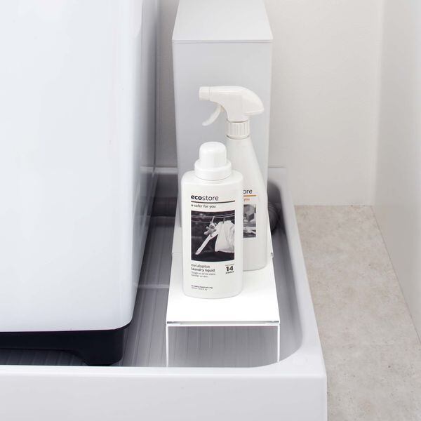 洗濯機の排水口とホースを隠しながら、その上を有効活用できる伸縮ラック。