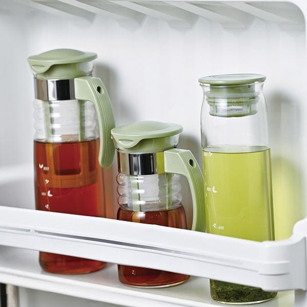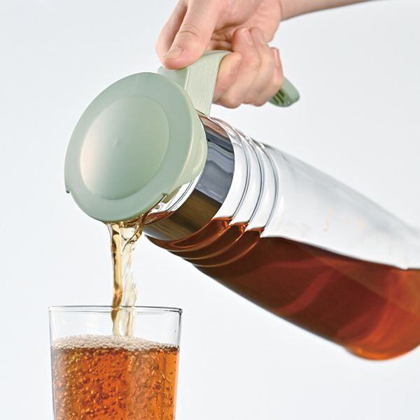 ○かご網茶こしの付いた水出し茶ポット○かご網の茶こしに茶葉を入れ、水を入れます。