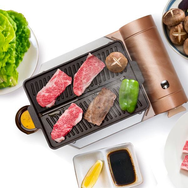 ○お肉の余分な油を落とす溝付プレートを採用※油を溜めないことで野菜を焼く時に油の飛び散りを抑えます。