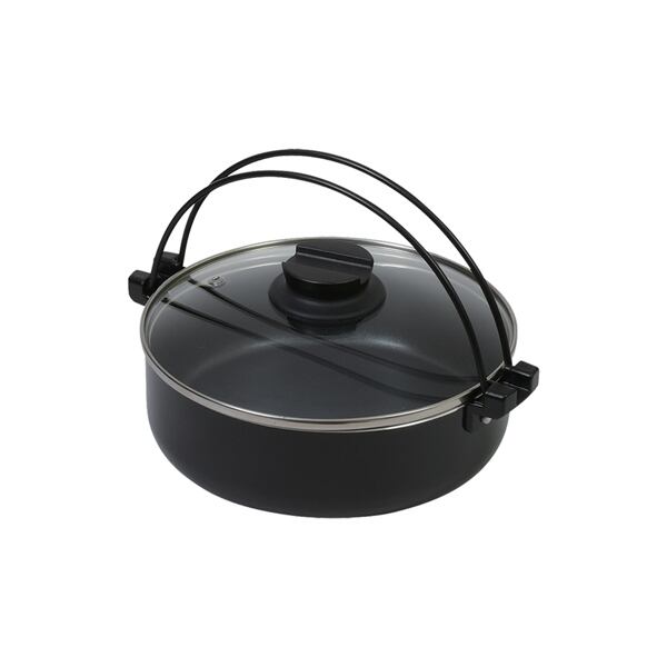 表面加工<br>内面:ふっ素樹脂塗膜加工外面:焼付け塗装<br>本体:アルミニウム合金<br>はり底:ステンレス鋼(クロム12%)<br>つる:鉄(エポキシ樹脂塗装) 蓋:強化ガラス(全面物理強化)<br>縁リング:ステンレス鋼<br>つまみ・座板:フェノール樹脂(耐熱温度150)