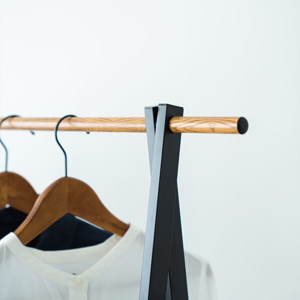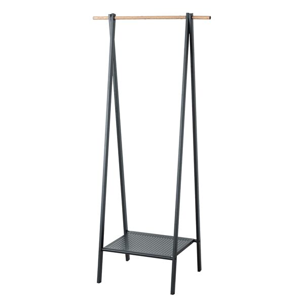 〇安定感のある三角設計でスタイリッシュなデザインに加え、ハンガーバーとフックには木を思わせるリアルな木目柄を施しました。
