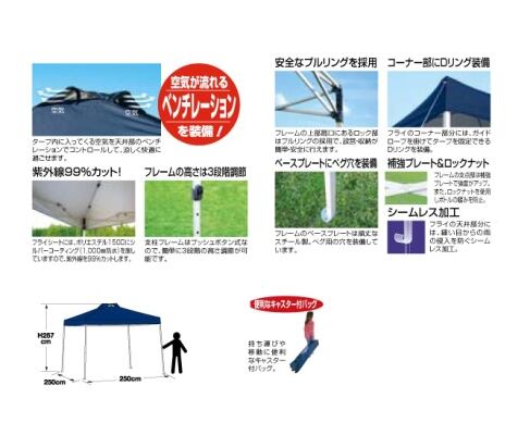 フライ:ポリエステル150D・シルバーコーティング(1、000mm防水)UV加工フレーム:支柱=アルミルーフ・クローバー:鉄(粉体塗装)