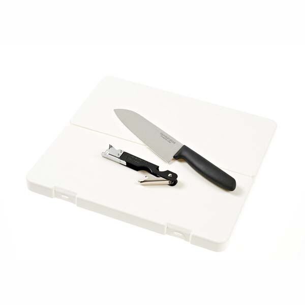 マナ板:ポリエチレン包丁:刃身(ステンレス鋼)・ハンドル(ポリプロピレン)三徳缶切本体:鉄(メラミン樹脂塗装)切り刃:炭素鋼(クロムめっき)穴開け:鉄(ニッケルめっき)