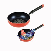 本体:アルミニウム合金表面加工内面:ふっ素樹脂塗膜加工 外面:焼付け塗装はり底:ステンレス鋼(クロム16%)取っ手:フェノール樹脂(耐熱温度150度)