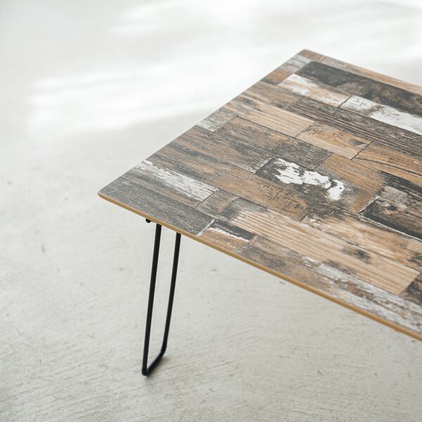 〇ダメージ加工を施した様々な木目を組み合わせた天板とブラックスチールは、お部屋の雰囲気を引き締めヴィンテージ感を演出。