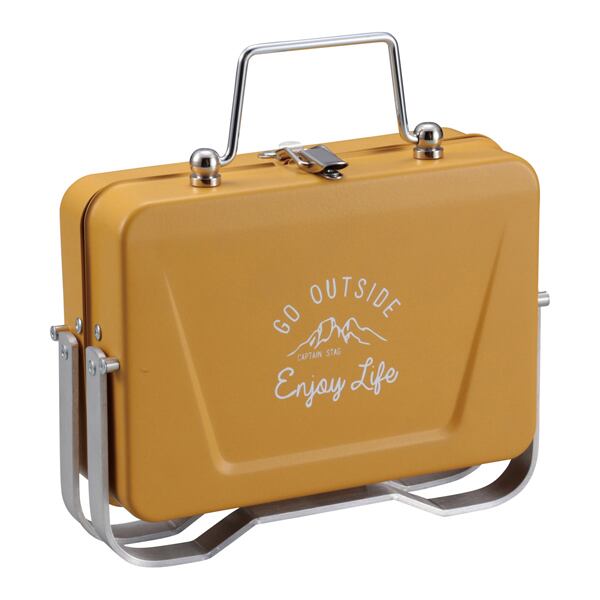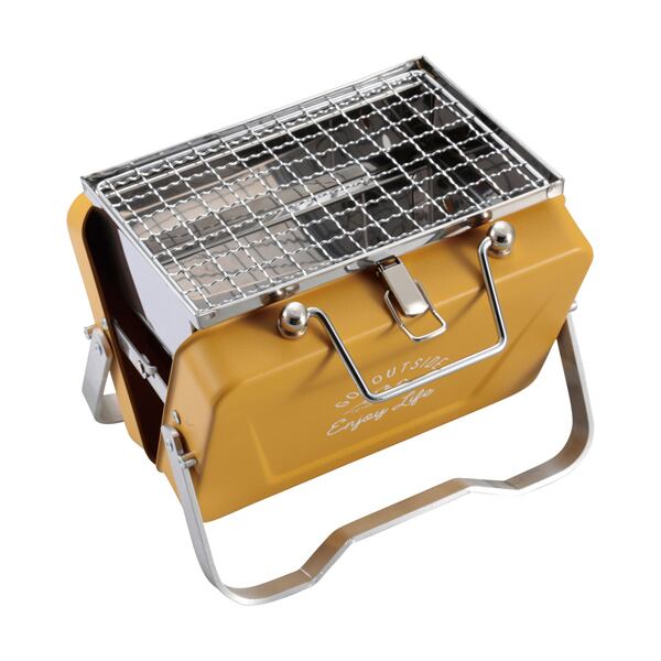 〇ソロキャンプやお花見・行楽に最適なコンパクトサイズのV型卓上グリル。