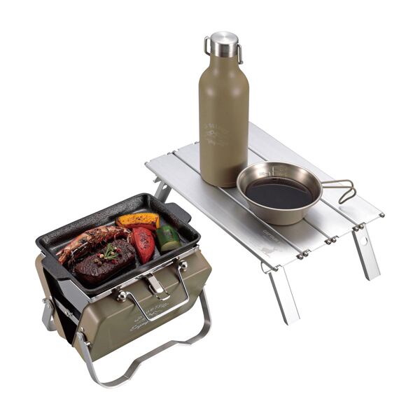 〇ソロキャンプやお花見・行楽に最適なコンパクトサイズのV型卓上グリル。