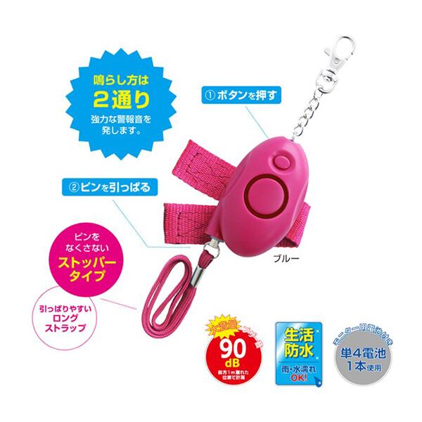 本体(プラカバー):ABSパッキン:シリコンラバーチェーン:スチール(ニッケルメッキ)ベルト・ロングストラップ:ナイロン付属品:単4電池((1本・作動テスト用) 仕様:生活防水 音量:90db認定:全国防協会連合会推奨アイテム