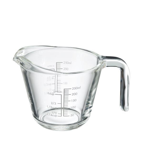 〇計量カップを使うときの目線を考え、上からのぞいたときに見やすくはっきり見えるメモリをつけました。