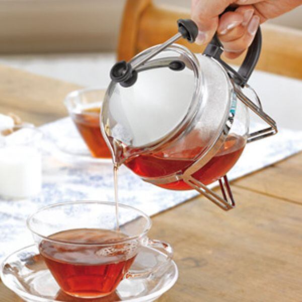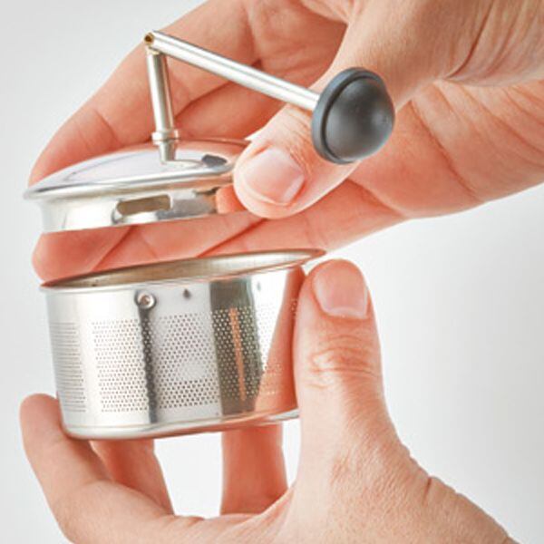 ○お好みの濃さで茶葉を引き上げられ、フタの内側に収まる茶こし。