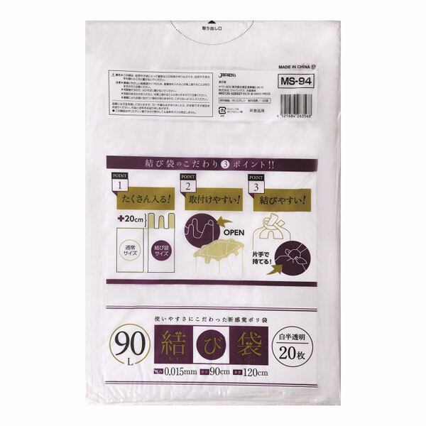 【30個セット】結び袋90L 白半透明 20枚(むすび部200mm)