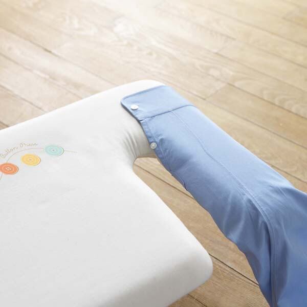 ○一体型仕上げ馬○ワイド天板○ボタンプレスゾーンの凹凸クッションにより、シャツなどのボタンが沈み込むので、スムーズなアイロンがけができます。