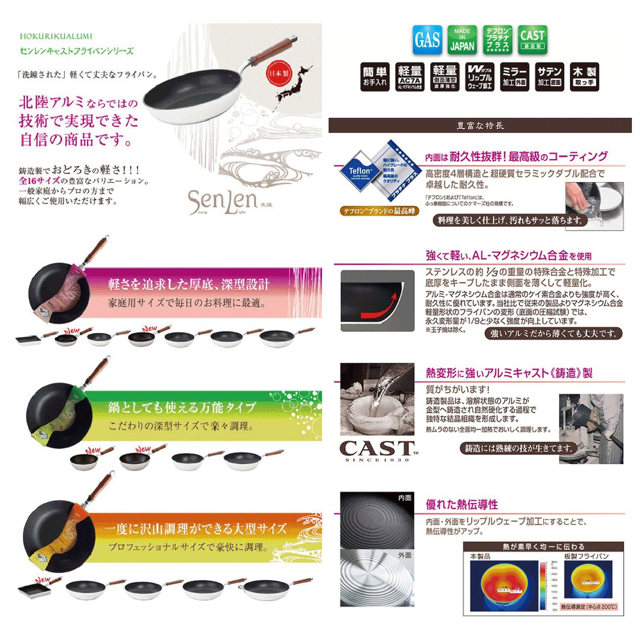 本体:アルミニウム合金(マグネシウム合金)内面:テフロンプラチナプラス加工外面:ミラー仕上げ底面:サテン仕上げ取っ手:天然木