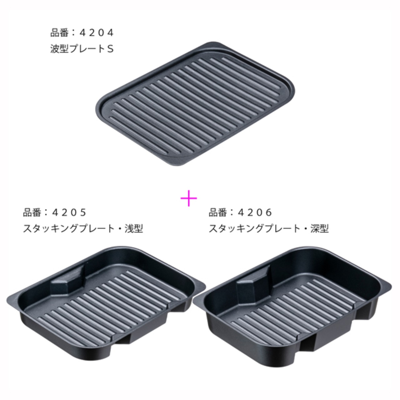 波型プレート・S商品サイズ(約):W180×D245×H7mm商品重量(約):350gスタッキングプレート・浅型商品サイズ(約):W180×D245×H30mm商品重量(約):450g容量(約):1.1Lスタッキングプレート・深型商品サイズ(約):W180×D245×H45mm商品重量(約):510g容量(約):1.6L
