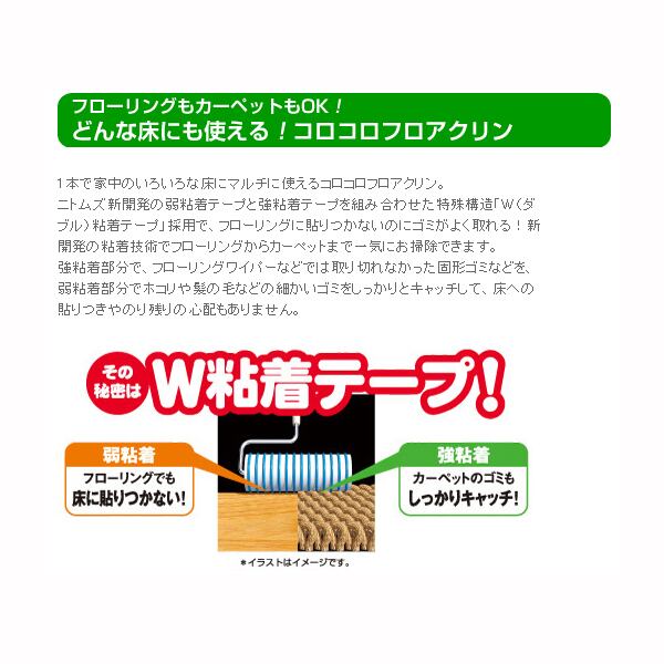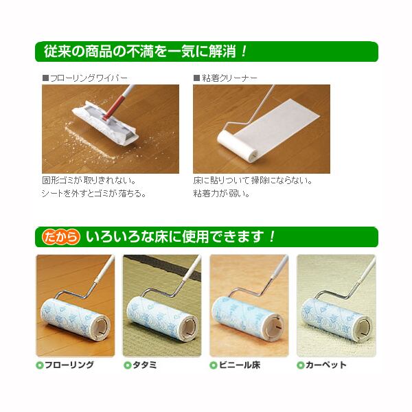 ○フローリングからカーペットまで使えるW粘着テープ。○フローリングでも床に張りつかず、ノリ残りせず快適お掃除。○一度捕らえたゴミはしっかりキャッチ 。