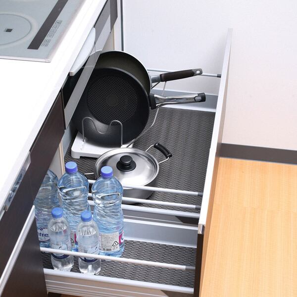 ○システムキッチンの収納空間にあわせたサイズバリエーションと機能(消臭抗菌加工)を持ち、シートのクッション性が敷く場所の傷付きを防ぎます。