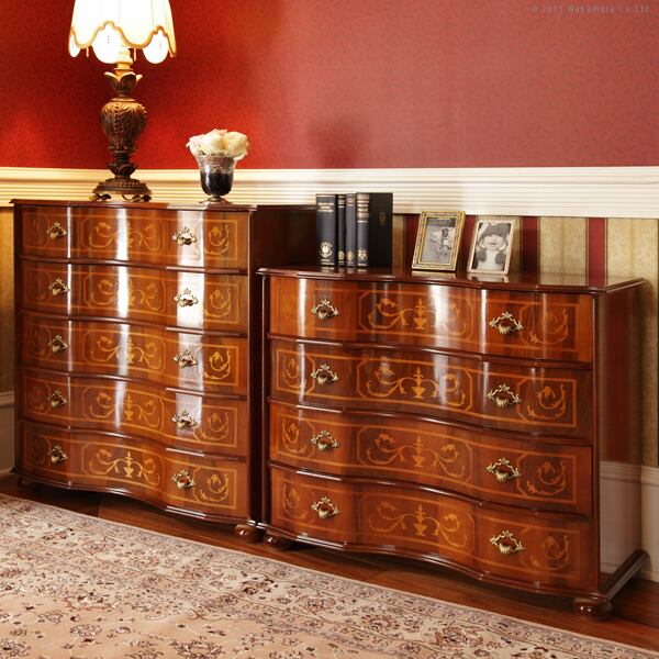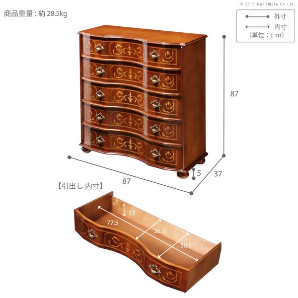 イタリア 家具 ヴェローナクラシック 丸脚5段チェスト W87cm 丸脚 輸入家具 アンティーク風 イタリア製 おしゃれ 高級感 木製 天然木 リモート 在宅