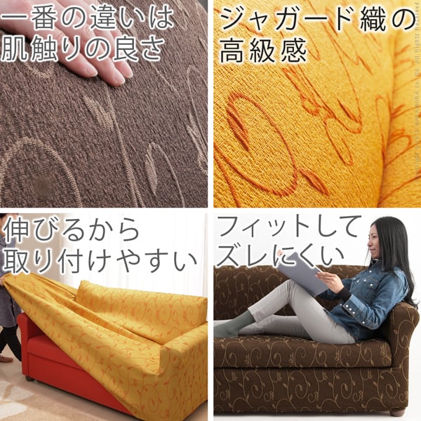 商品について:ジャガード織りの高級感あるスペイン製のソファカバー。横方向のストレッチ生地で高いフィット感です。控えめな草花柄がすっきりとした印象です。