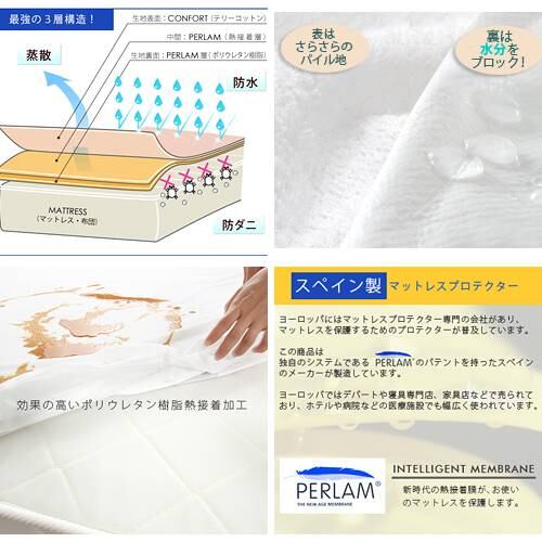 商品について:裏面にポリウレタン樹脂コーティングされたプロテクター。確実な防水性で汚れだけでなく、ダニやハウスダストからも守ります♪マットレスを綺麗な状態に保ちます。高品質のスペイン製。