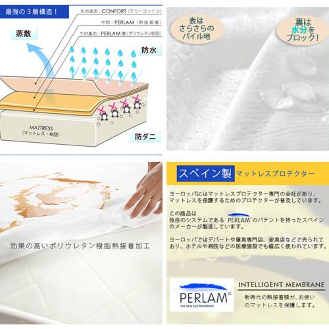商品について:裏面にポリウレタン樹脂コーティングされたプロテクター。確実な防水性で汚れだけでなく、ダニやハウスダストからも守ります♪マットレスを綺麗な状態に保ちます。高品質のスペイン製。