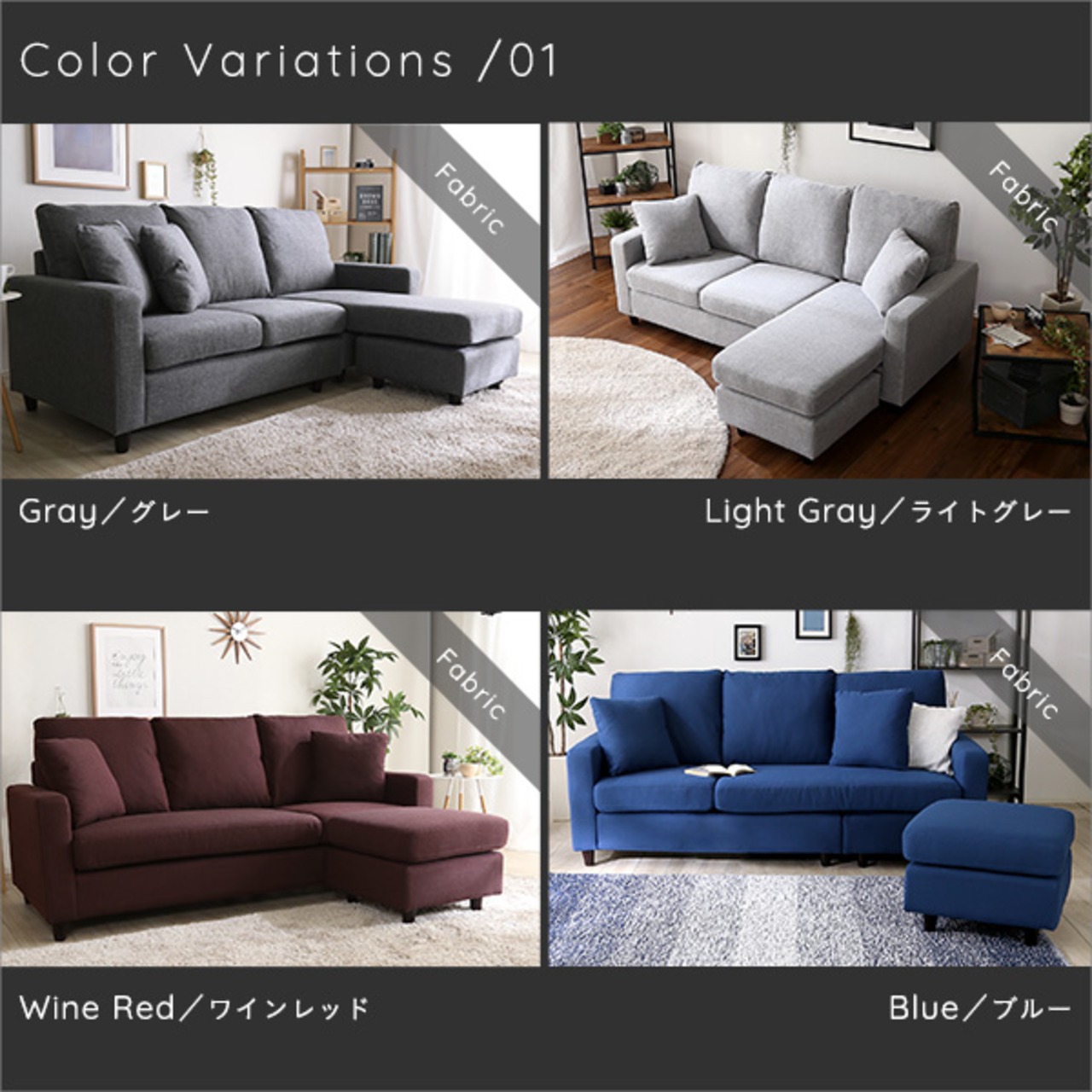 ライトグレー(LGY)、ブラック(BK)、グレー(GY)、ブルー(BL)、ワインレッド(WRD)、PVCホワイト(PVCWH)、PVCブラック(PVCBK)、PVCブラック/ベージュ(PBKBE)