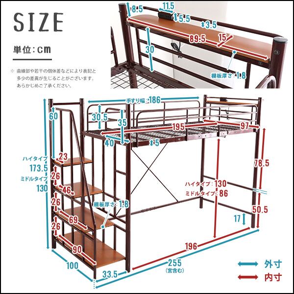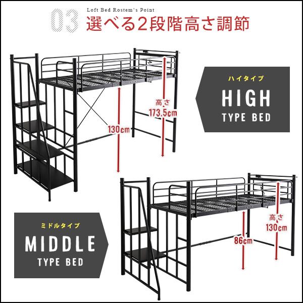 階段付パイプロフトベッド(4色)、ハイタイプでもミドルタイプでも選べる大容量の収納力 | Rostem-ロステム-