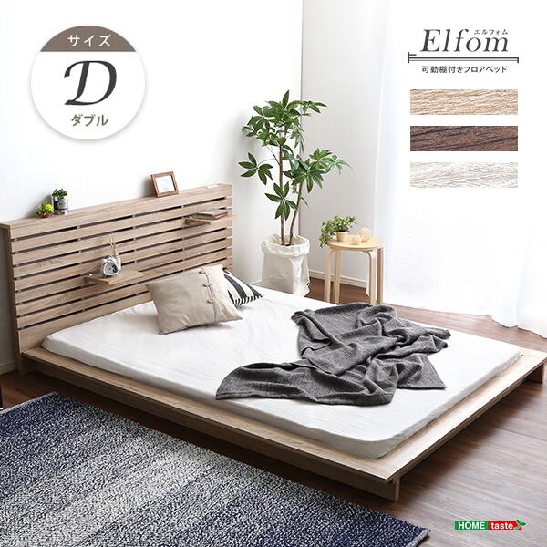 可動棚付きフロアベッド(ダブル)ベッドフレーム、ロースタイル、スリムヘッドボード|Elfom エルフォム