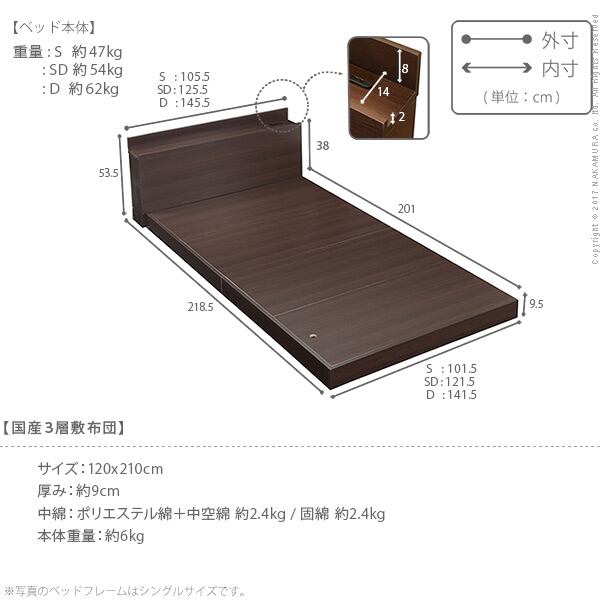 敷布団でも使えるフラットローベッド カルバンフラット セミダブルサイズ+国産3層敷布団セット フロア コンセント 宮付き 木製 布団セット シンプル