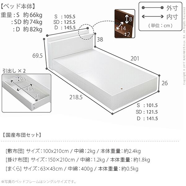 敷布団でも使えるフラットストレージベッド カルバンストレージ シングルサイズ+国産洗える布団3点セット コンセント 引出 宮付き 木製 布団セット シンプル