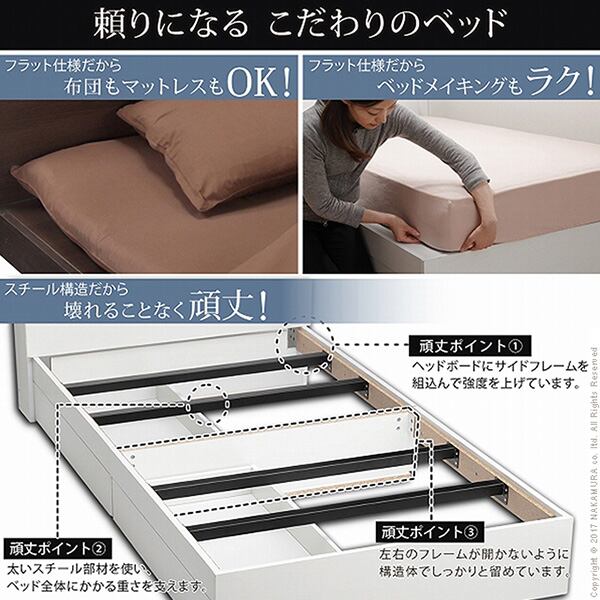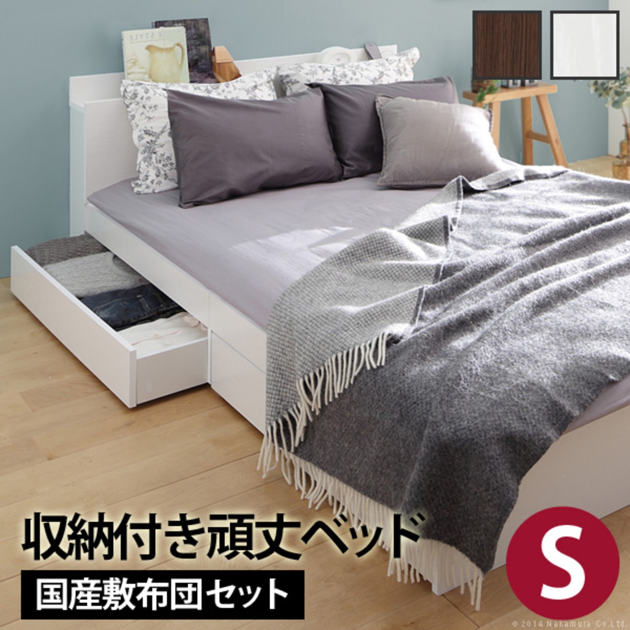 敷布団でも使えるフラットストレージベッド カルバンストレージ シングルサイズ+国産3層敷布団セット コンセント 引き出し 宮付き 木製 布団セット シンプル
