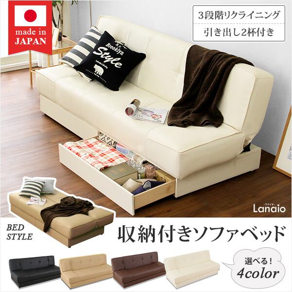 引き出し2杯付き、3段階リクライニングソファベッド(レザー4色)日本製・完成品|Lanaio-ラナイオ-